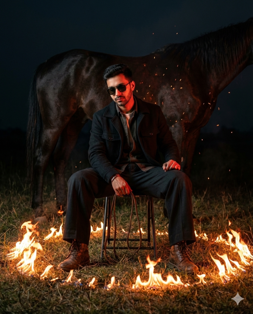 The Aura Farm horse photo editing prompt is a specially designed AI prompt that helps Gemini create cinematic, monochrome, luxury-style images. These images typically depict a calm or confident person seated in a relaxed pose, with a strong black horse standing behind them, creating a powerful and mysterious aura.