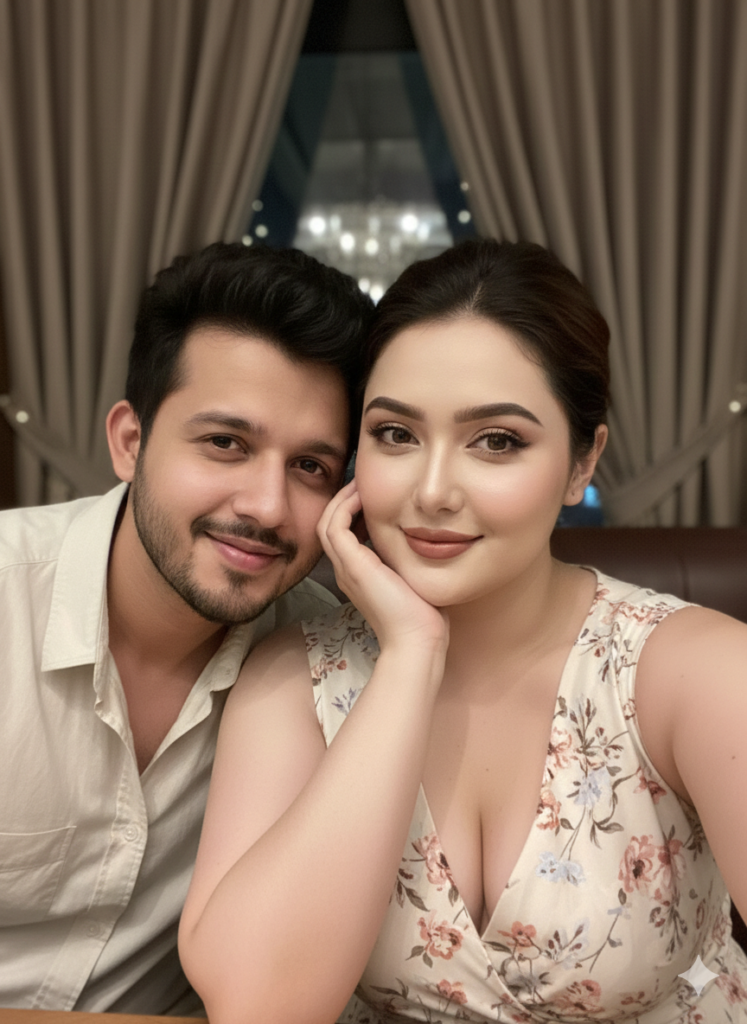 Candid indoor close-up couple selfie, cozy restaurant/bar setting, soft ambient light with gentle flash. Girl in the foreground resting her cheek on one hand, wearing a light floral sleeveless dress, soft blush, and glossy lips, relaxed smile. Boy leaning in from the left, casual shirt, warm friendly expression. Curtains and dim lights in the background, natural skin texture, smartphone front-camera selfie feel, real candid vibe.[LOCK-EXACT | same pose, same framing, same angle, same lighting, same expressions, zero variation]Ultra HD 8K, Ratio 9:16, keep my face 100% same as in the reference image. Generate